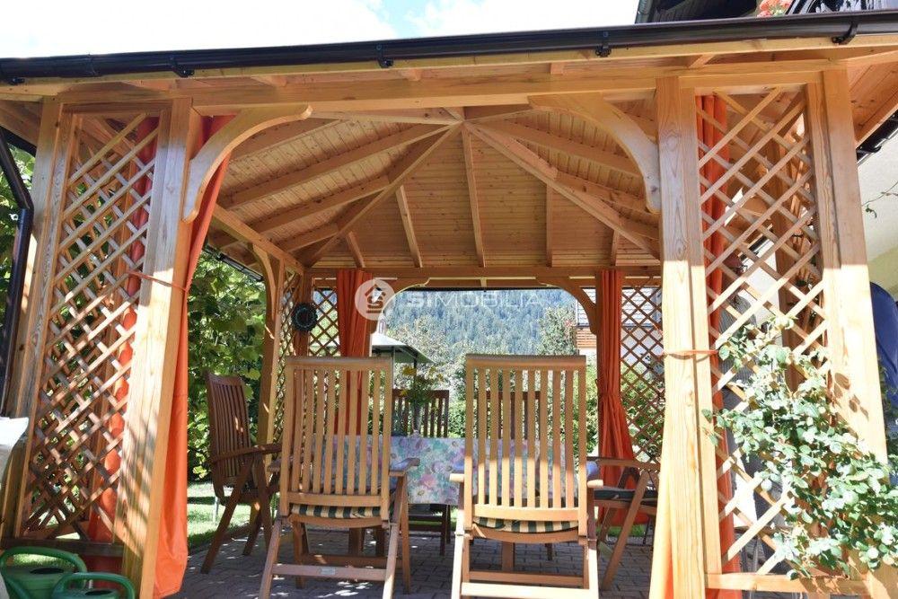The plot is landscaped with horticultural design, and a wooden pavilion stands in front of the house. The yard is spacious, paved, and accessible via electric sliding gates.