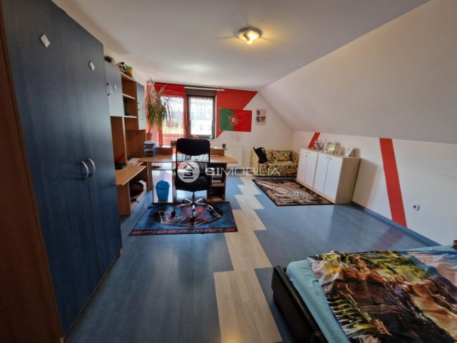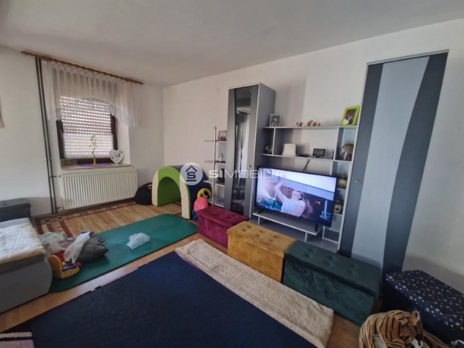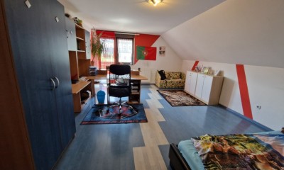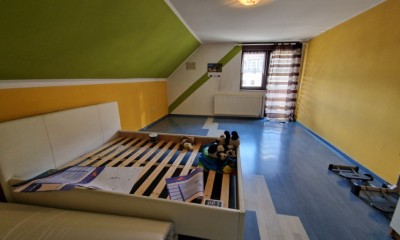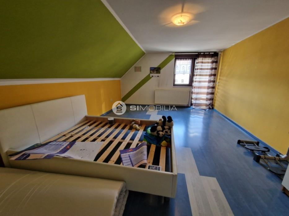Nadstropje: predprostor s krušno pečjo, dnevno-bivalni prostori s kuhinjo, 2 sobi in kopalnica